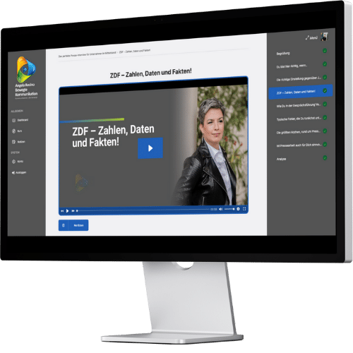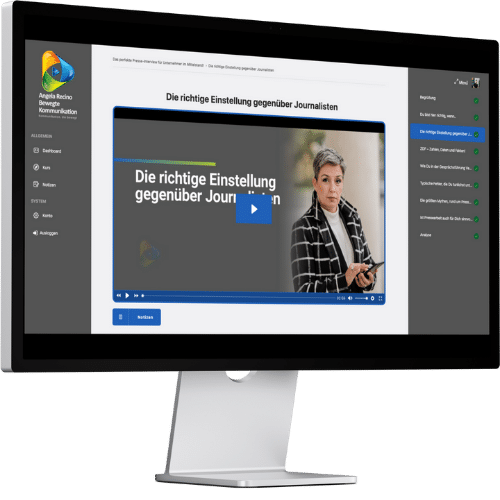 In dem Videokurs „Das perfekte Presseinterview“ vermittle ich Dir die entscheidenden Strategien, um souverän in der Öffentlichkeit aufzutreten.